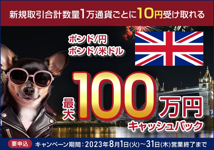 キャンペーンに申し込まれたお客さまに、期間中におけるポンド/円とポンド/米ドルの新規取引合計数量に応じて、最大1,000,000円をキャッシュバックします。