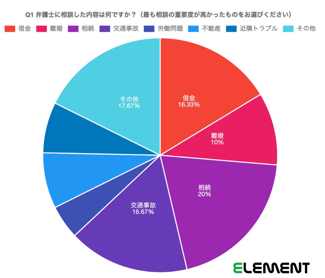 弁護士への相談内容ランキングでは、1位が20%で「相続問題」に関するトラブルや手続きのサポートを求めるニーズ、2位が16.67%で事故後の交渉や法律知識を必要とする「交通事故」、そして3位が16.33%で借金の整理方法を知りたい「借金」に関する相談となっています。