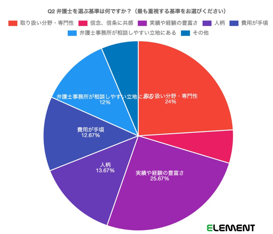 • 弁護士を選ぶ基準として最も意見が多かったのは、25%の人が回答した「実績や経験の豊富さ」