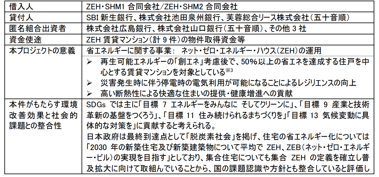 本ファンドでは株式会社池田泉州銀行(大阪府大阪市、代表取締役頭取兼CEO鵜川 淳)及び芙蓉総合リース株式会社(東京都千代田区、代表取締役社長 織田 寛明)がメザニンローンを提供する他、金融機関を含む計5社が匿名組合出資をしています。なお、SBI新生銀行サステナブルインパクト評価室ではこれらシニア・メザニンローン及び匿名組合出資に対しても「グリーンローン原則」への適合性評価を実施しており、これらのファイナンスはすべてグリーンファイナンスとして実行されました。