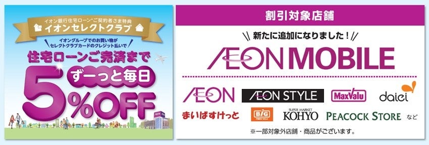 「イオンセレクトクラブ」は、イオン銀行住宅ローンご契約者さま特典としてイオングループ対象企業および店舗での毎日のお買い物が、ローンご完済まで5%OFFになるなど、生活に密着したイオングループの銀行ならではの特典です。また、イオン銀行住宅ローンは、同特典に加え、魅力ある金利プランによるおトクさと、全国147か所のイオン銀行店舗にて朝から夜まで365日スタッフと対面でご相談・お申込みいただけるほか、WEB においてもお申込みからご契約まで完結いただける利便性の高さから、お客さまより大変ご好評をいただいております。
