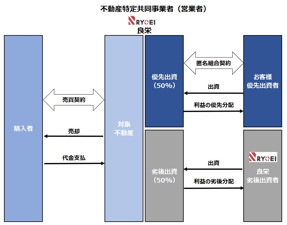 優先劣後⽅式の出資割合を優先50%:劣後50%とすることで、より安全性を⾼めています。