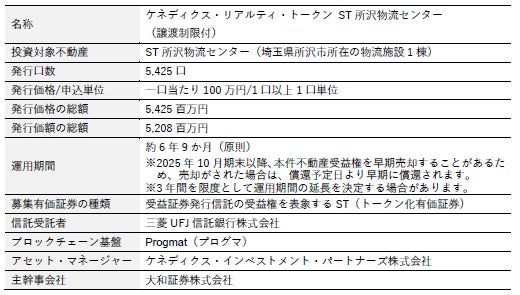 本STは資産規模130億円の埼玉県所沢市に所在する希少性の高い大型物流施設を裏付け資産とし、本STを含めて、ケネディクスのグループ会社が運用する不動産セキュリティ・トークン(以下「不動産ST」)は計7本、裏付け資産の累計総額は592億円となっております。