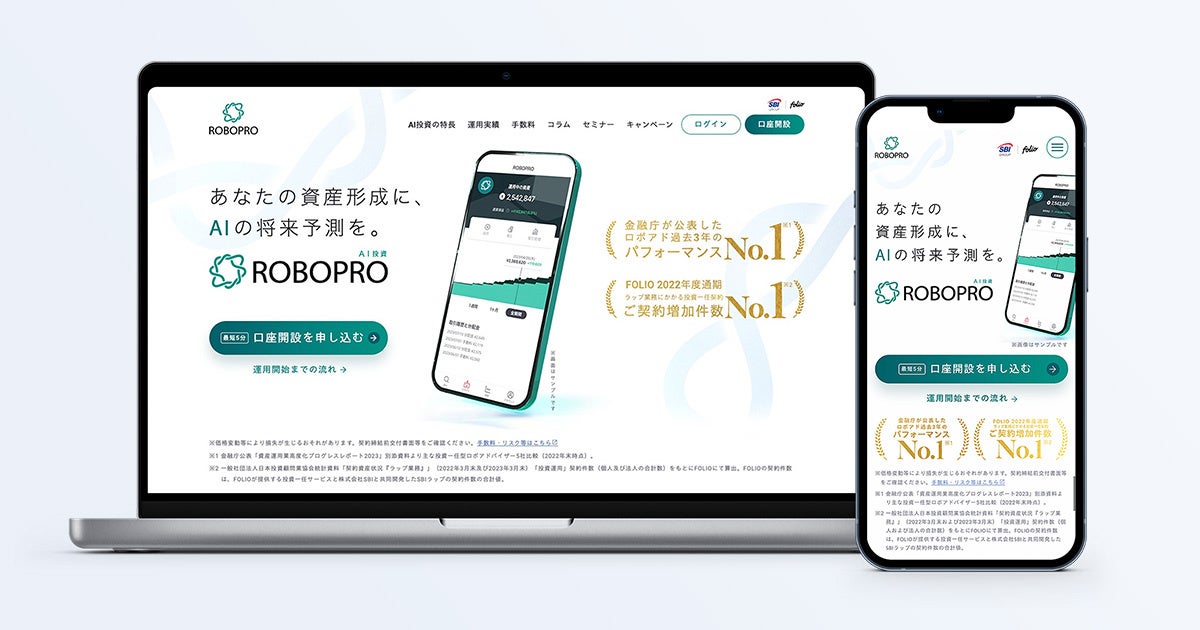 2023年7月18日(火)より、「FOLIO ROBO PRO」の名称を「ROBOPRO」へ変更しております。また、2023年8月7日(月)より、新たにブランドロゴを設定し、ROBOPROのウェブサイトのリニューアルを行いました。ROBOPROの魅力であるAI投資のしくみやメリット、これまでの運用や実績の背景などを分かりやすく紹介しており、これから資産運用を始める準備が十分にできるようなウェブサイトを目指しています。