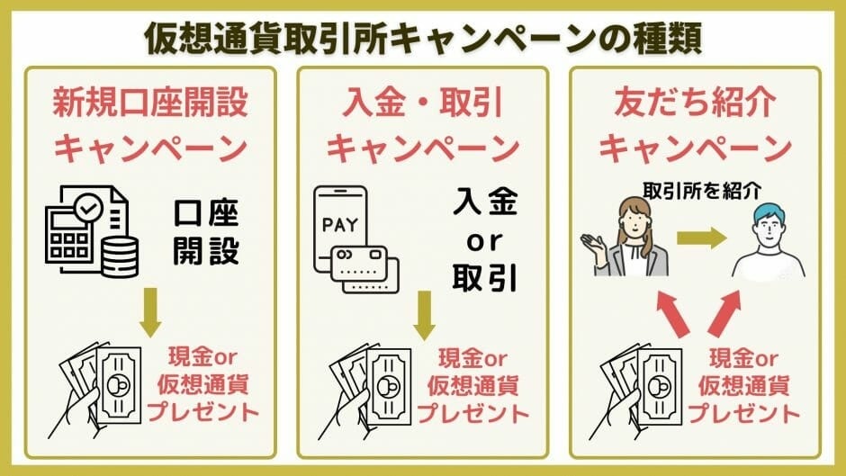 仮想通貨取引所で実施されているキャンペーンは、下記の3種類です。