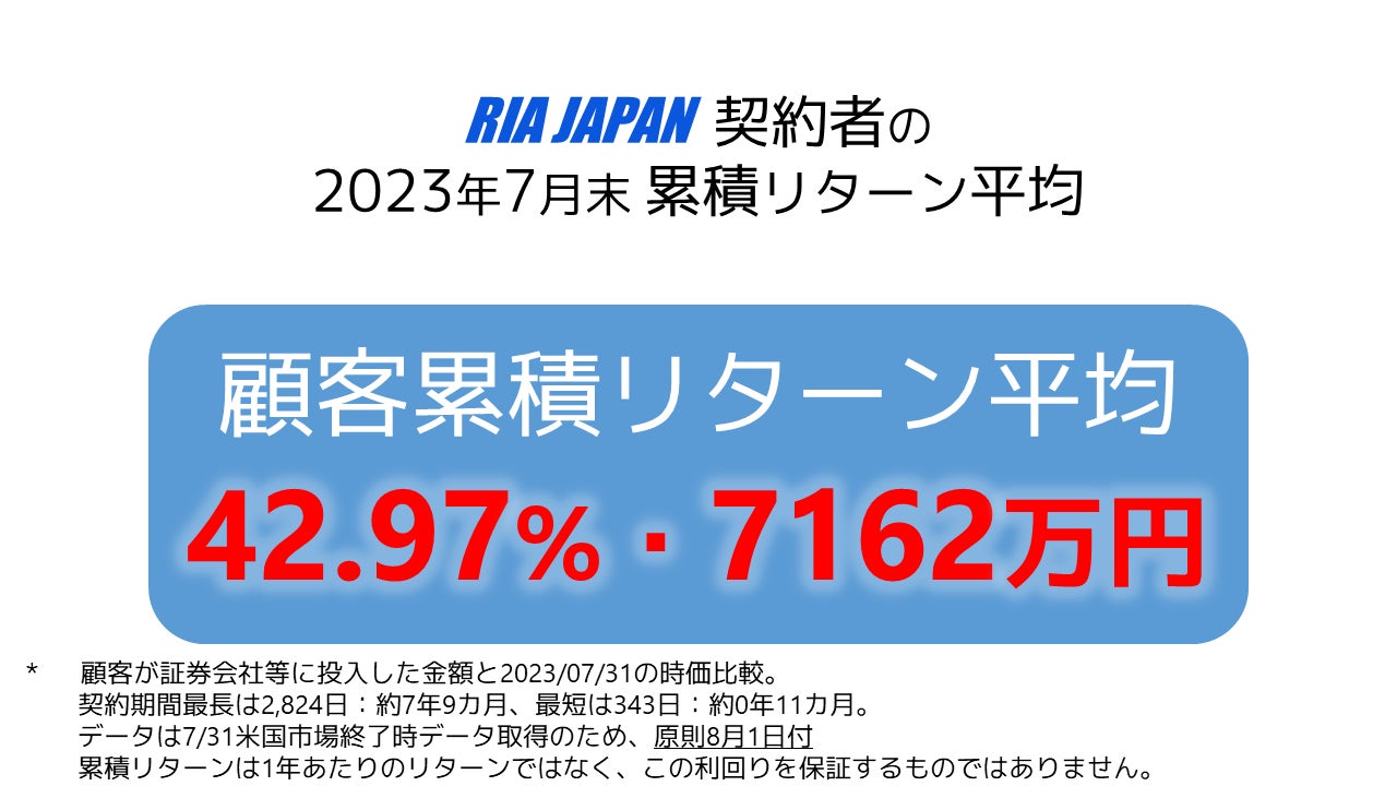 2023/7/31時点 *の顧客累積リターン平均は42.97%で、顧客累積リターン額平均は+71,626,364円でした。