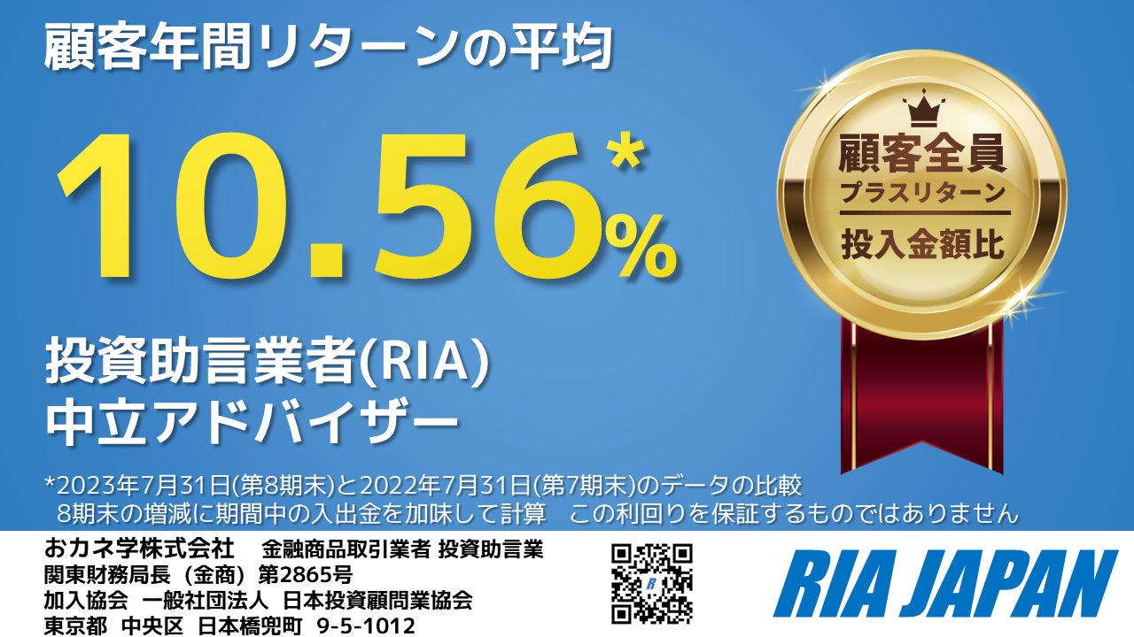 資産運用のアドバイスに特化する中立アドバイザーで、証券会社などから手数料・キックバック等を受け取らず、投資助言を提供するRIA JAPANは、2023年7月末の第8期決算終了時点の計数などを発表しました(速報値)。