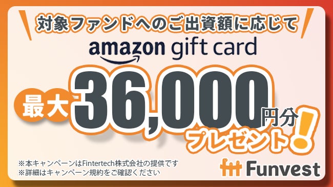 また、本ファンドへの出資額に応じて最大36,000円分のAmazonギフトカードをプレゼントするキャンペーンを併せて実施いたします。