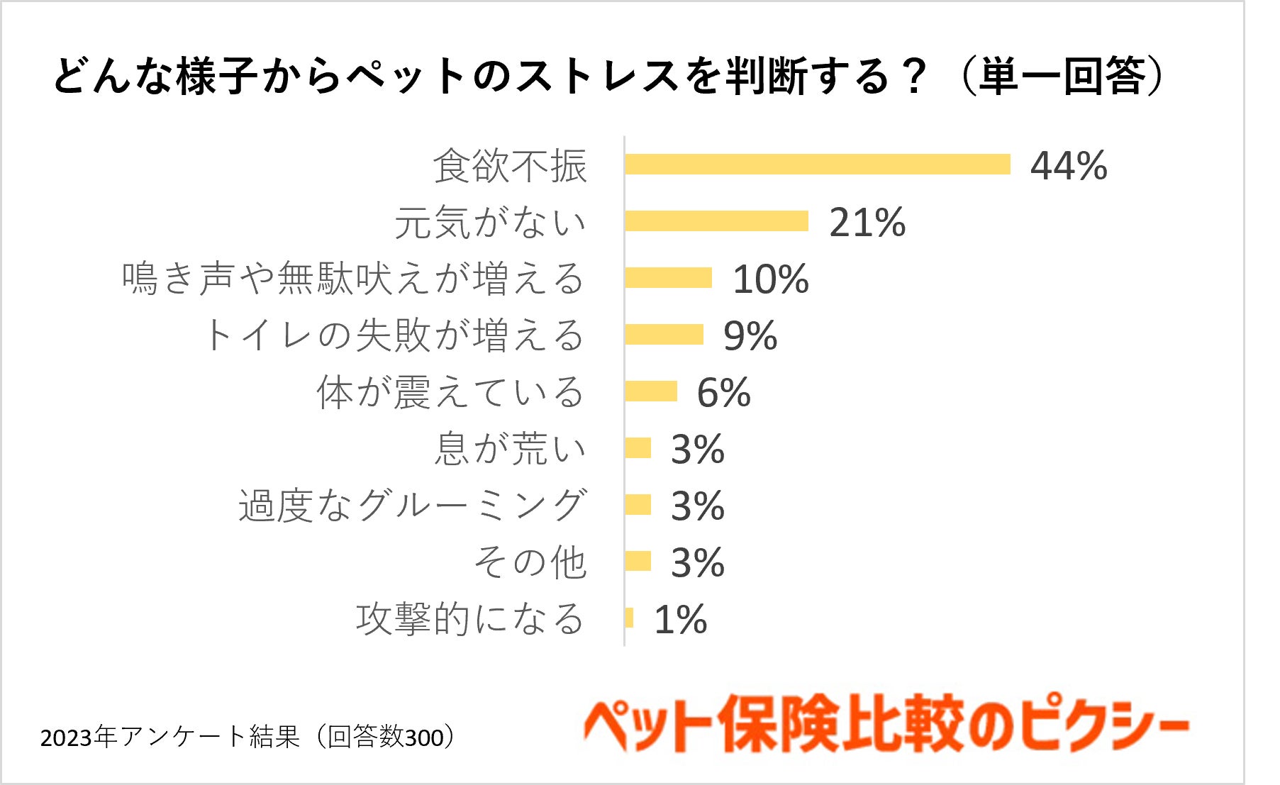 次に、どのような様子からペットのストレスを判断しているか聞いたところ、1位は「食欲不振(44%)」でした。