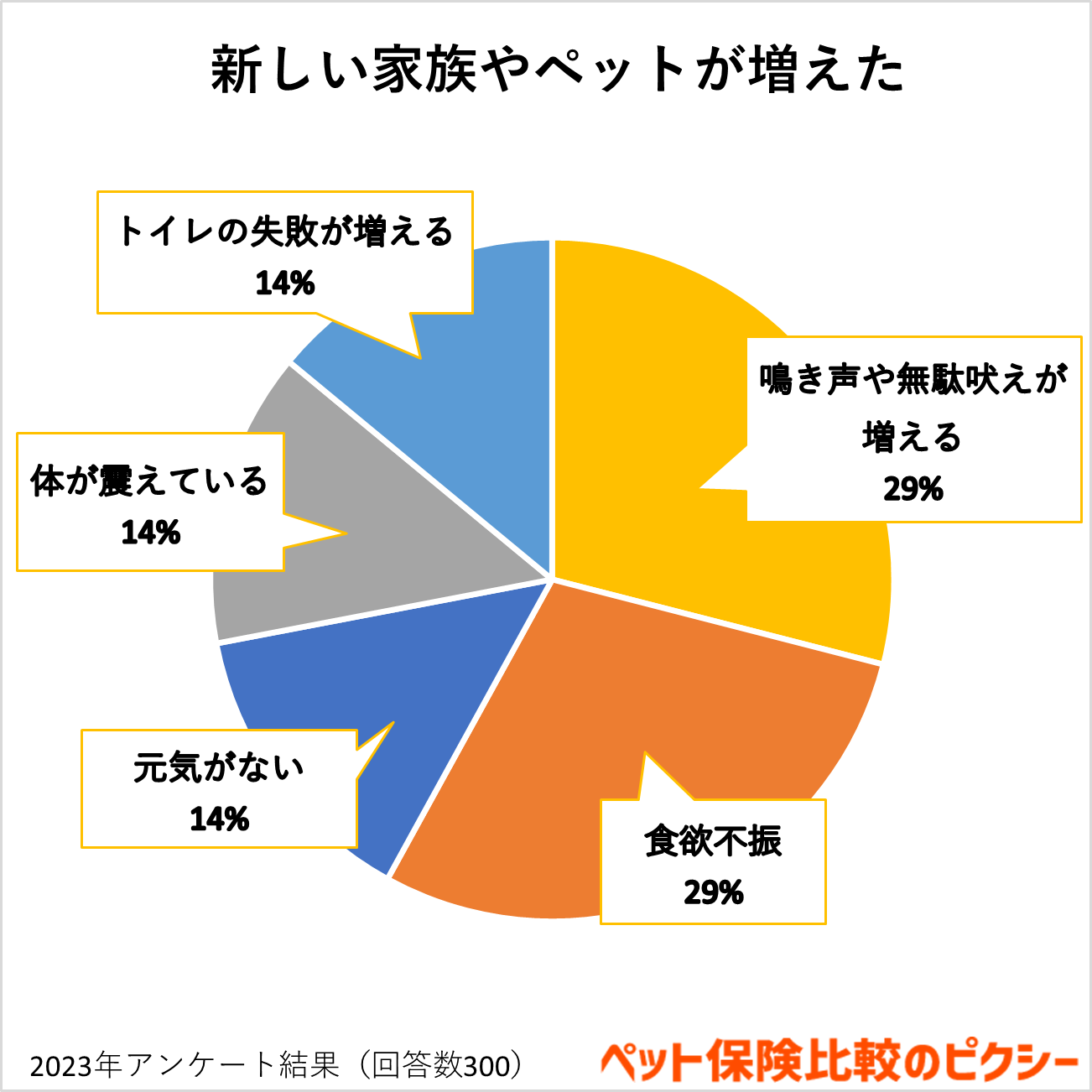新しい家族やペットが増えると、個体によってさまざまな様子があらわれますが、「食欲不振」や「鳴き声や無駄吠えが増える」ペットの割合が多いことがわかります。