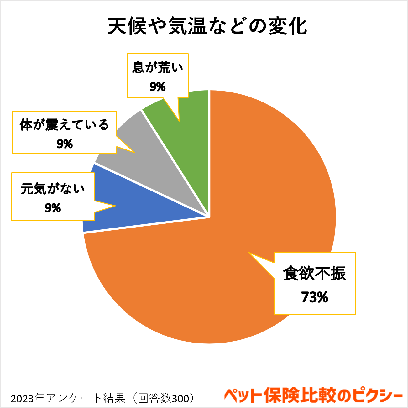 対して、天候や気温などが変化すると「食欲不振」になるペットが多くみられ、7割を超える結果となりました。