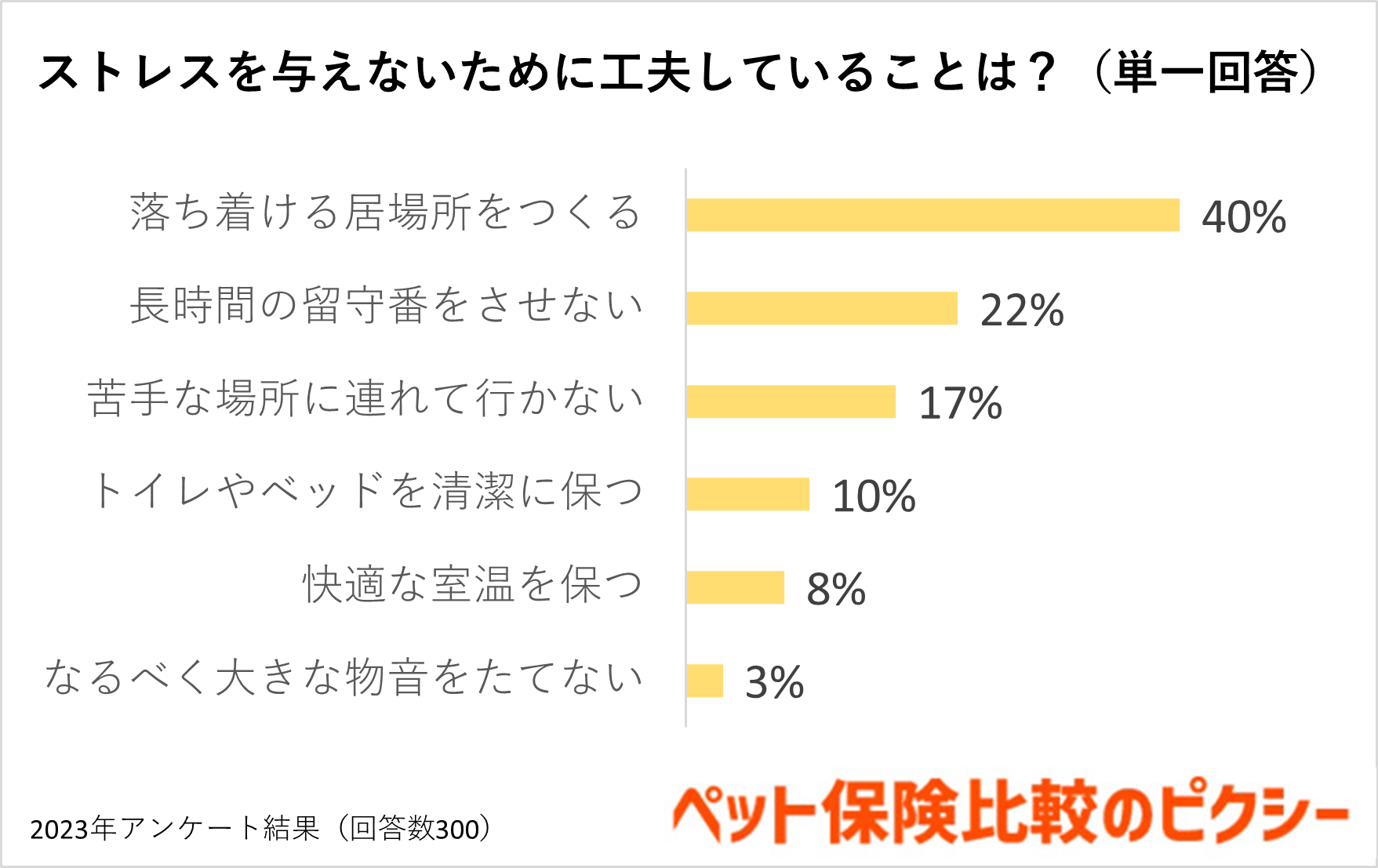 ペットにストレスを与えないために工夫していることを聞いたところ、1位は「落ち着ける居場所をつくる(40%)」となりました。専用スペースがあることで、精神的に安定し落ち着くことができるようです。