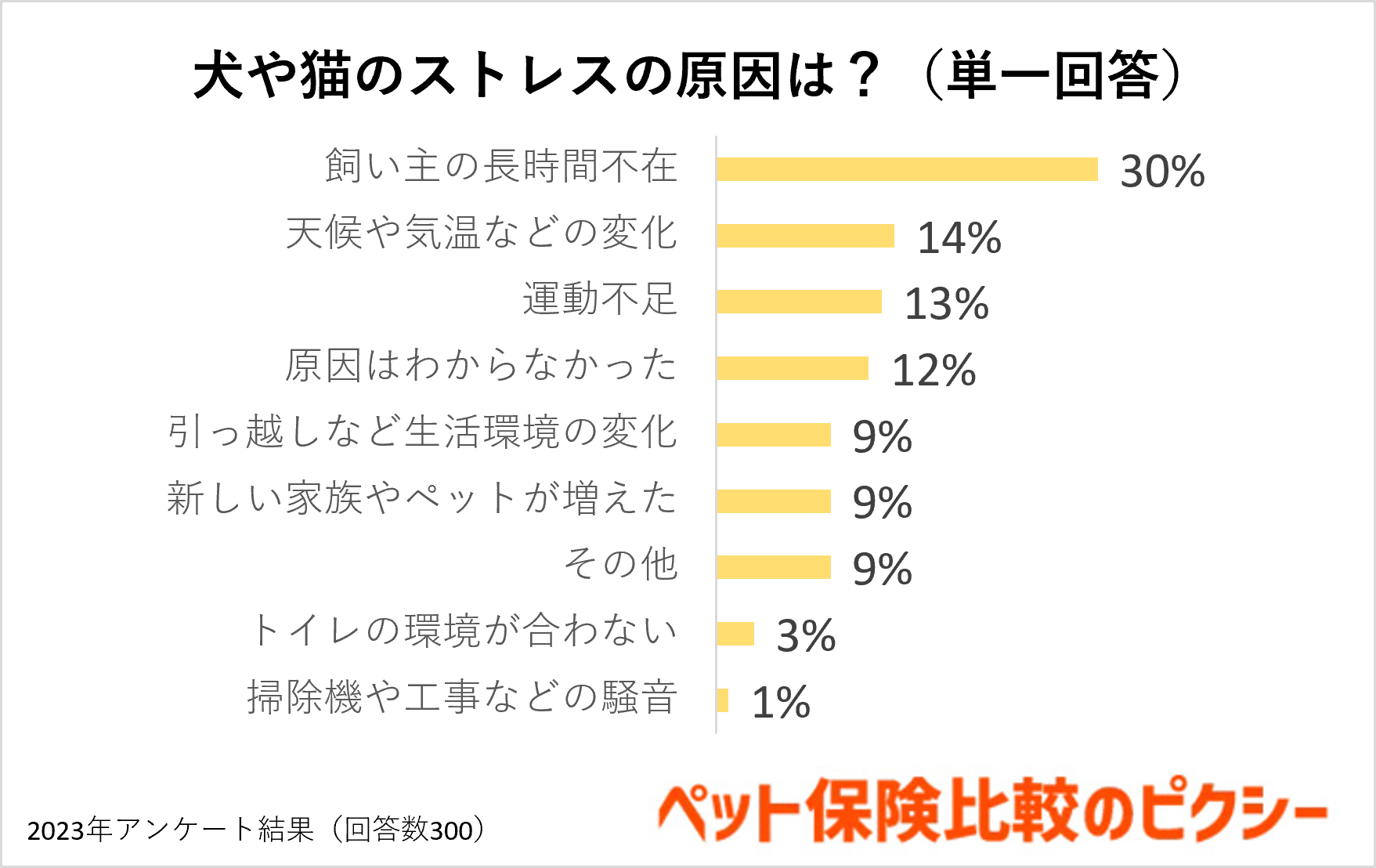 ペットのストレスの原因を聞いたところ、1位は「飼い主の長時間不在(30%)」でした。