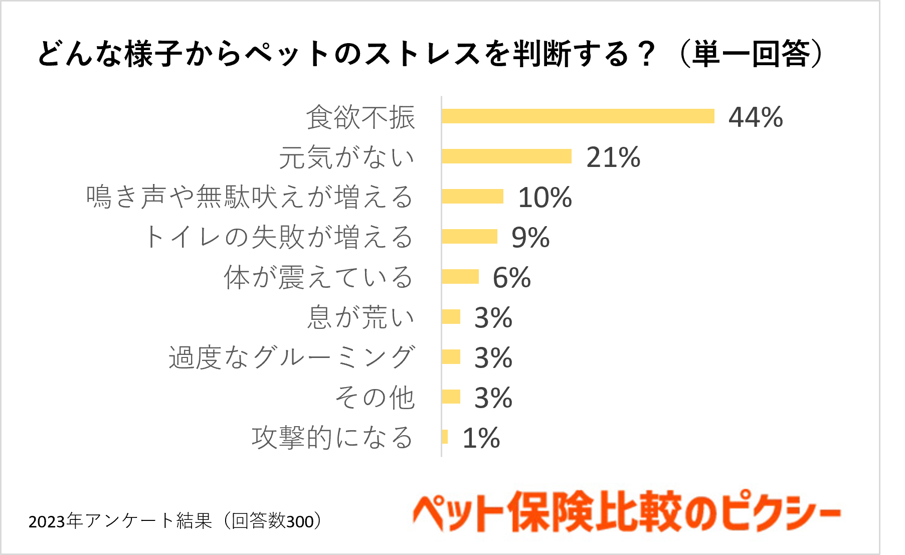 次に、どのような様子からペットのストレスを判断しているか聞いたところ、1位は「食欲不振(44%)」でした。