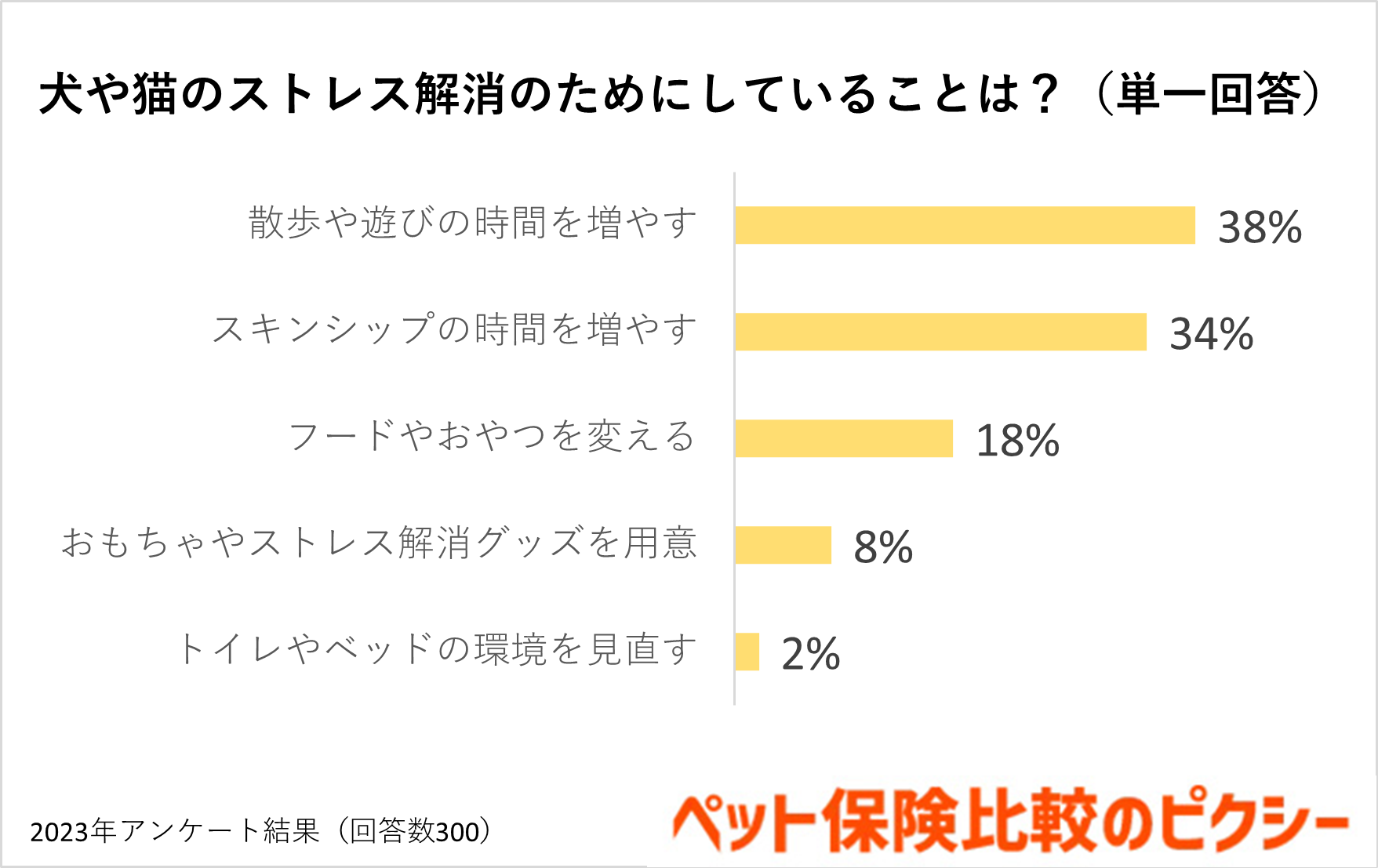ペットのストレス解消のためにしていることを聞いたところ、1位は「散歩や遊びの時間を増やす(38%)」となりました。ストレス解消には運動が効果的と感じている飼い主さまが多いことが伺えます。