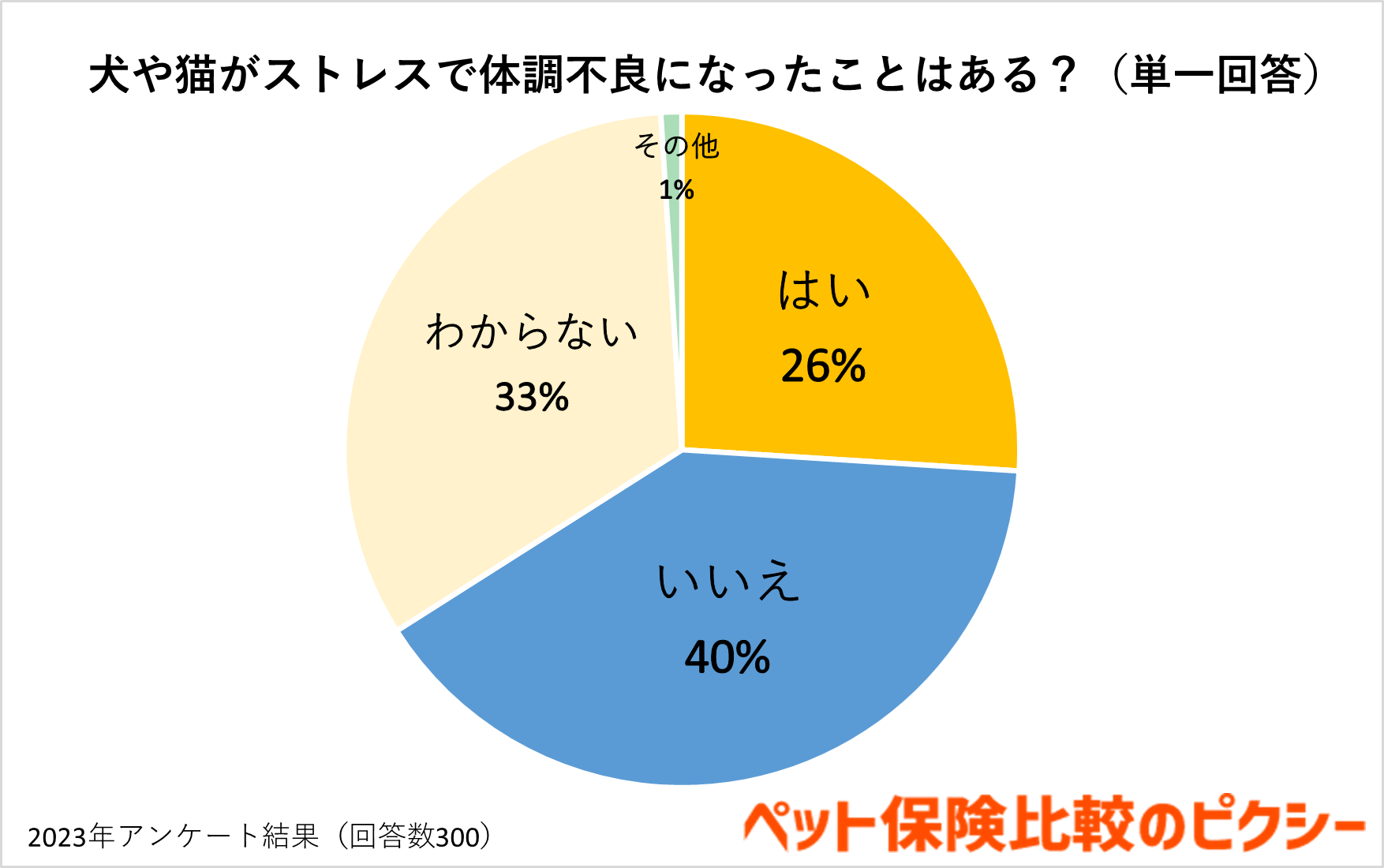 まず、ペットがストレスで体調不良になったことはあるかを質問したところ、「はい」と答えた方は26%、「いいえ」と答えた方は40%でした。