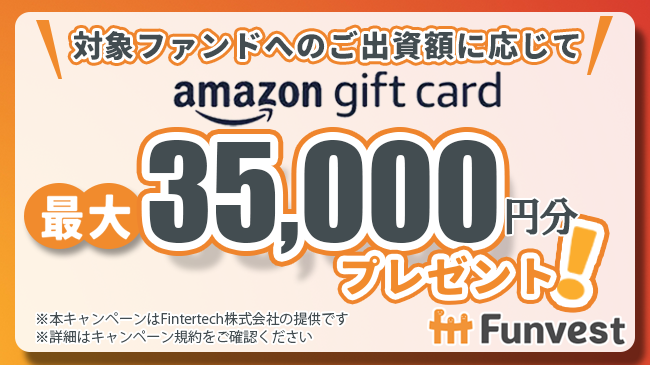 本ファンドへ出資していただいた投資家の皆様を対象として、出資額に応じて最大35,000円分のAmazonギフトカードをプレゼントするキャンペーンも併せて実施いたします。