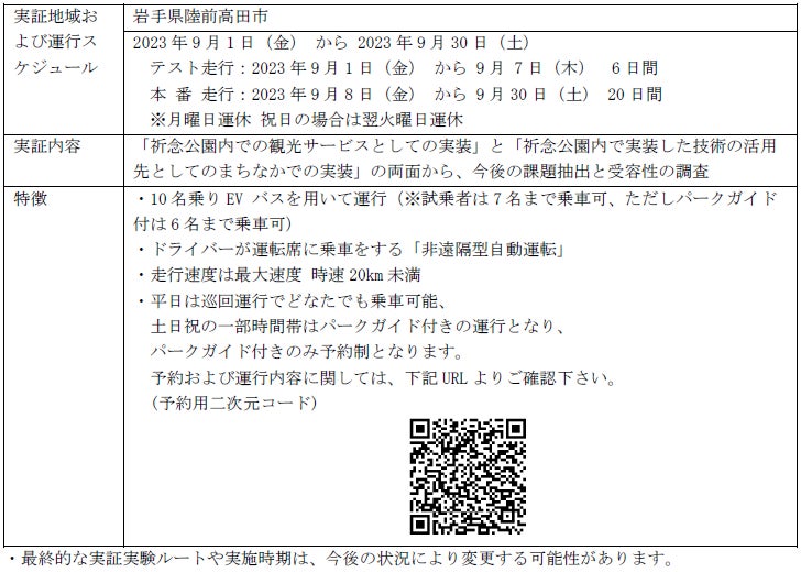 本運行は、2023年2月から3月に実施(注)した自動運転走行実証実験のルートに加え、「陸前高田市街地」までルートを拡大し走行します。土日祝日はパークガイドが車両に同乗する便も運行し、点在する東日本大震災に関連する施設を紹介します。従来までの「祈念公園内での観光サービスとしての実装」に加え、「祈念公園内で実証した技術の活用先としてのまちなかでの実装」を行い、両面から今後の課題抽出と受容性の調査を行います。