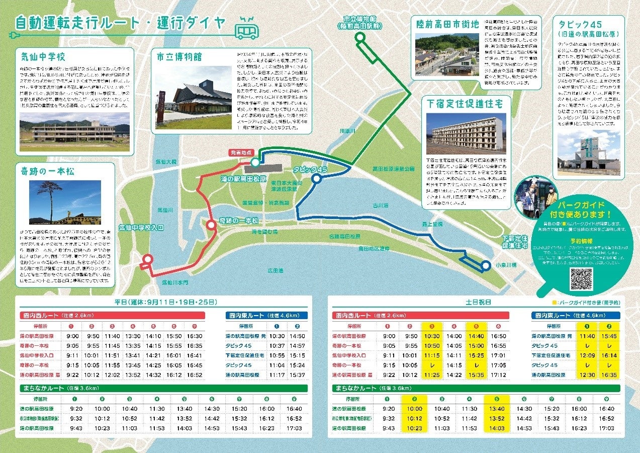 2022年は高田松原津波復興祈念公園内およびその周辺施設間を連結する移動手段の課題を解決するため、自動運転サービスなどを活用して公園内のガイドサービスを行うパークガイドと連携した新たな移動手段を構築し、地域課題の解決を目指し公園内で実証した結果や活用した技術を市内の生活路線などに展開していくことで、地域コミュニティの形成や地域生活の足の維持確保に向けた検討を進め、2025年度の本格運行開始を目指します。