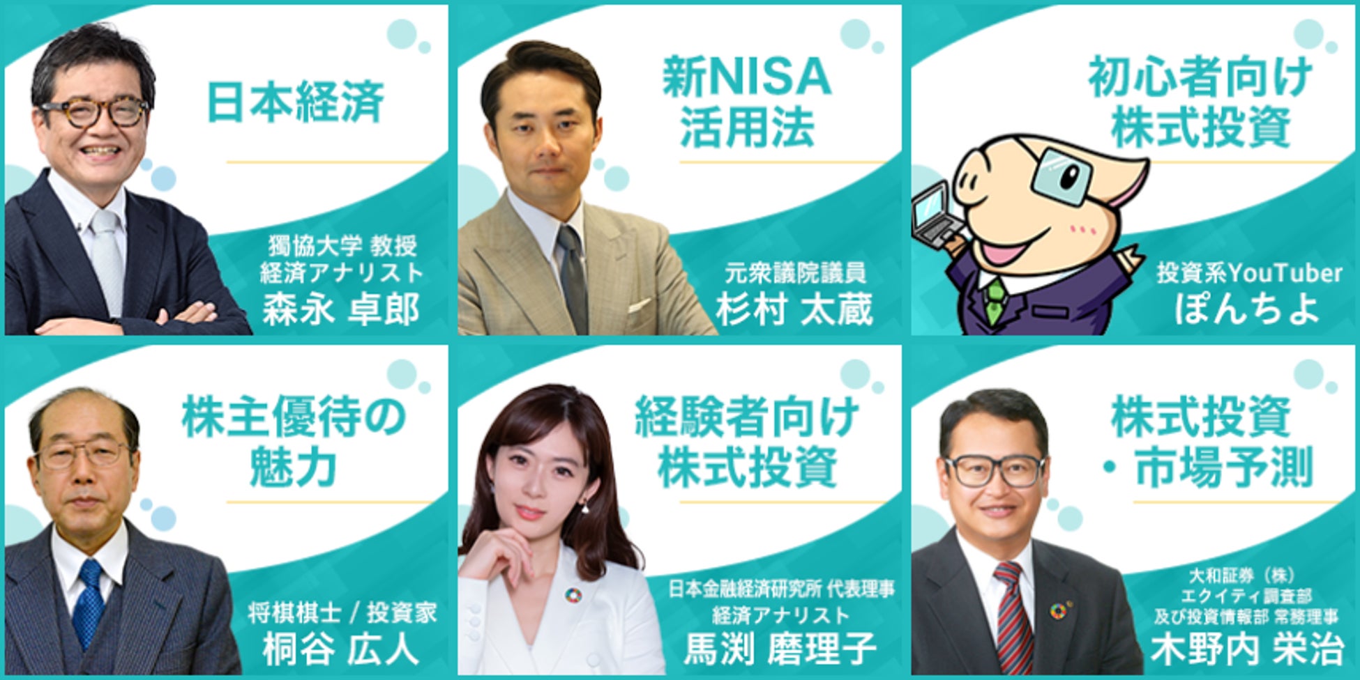 【森永卓郎氏】【桐谷広人氏】など、メディアでも注目されている講師が連日登壇し、【株式投資・米国株・投資信託・不動産投資・NISA・ライフプラン・為替】など、多様なテーマで講演します。今回は、2024年1月から開始の「新NISA制度」に関するセミナーも開催予定。最新情報の収集にご活用いただけます。