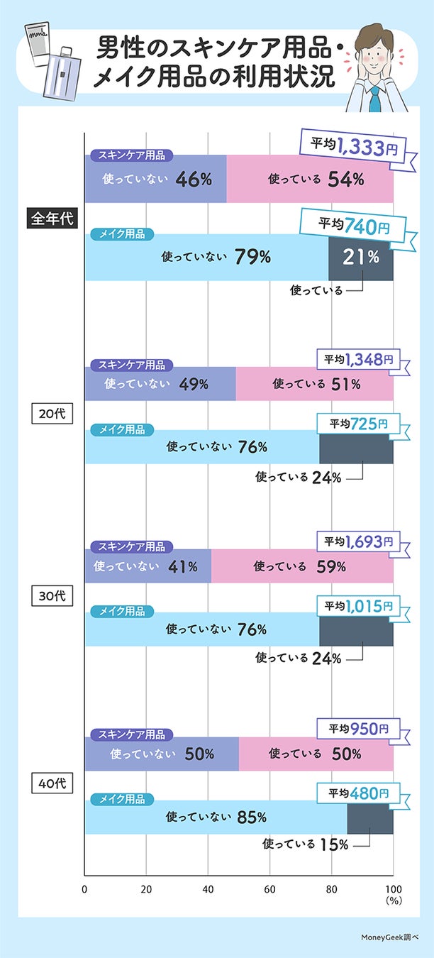 その結果、スキンケア用品を使っている男性は過半数で、メイク用品を使っているのは約20%でした。