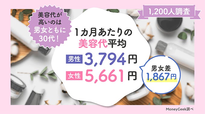 ・1カ月あたりの美容代平均は男性3,794円、女性5,661円。男女差は1,867円