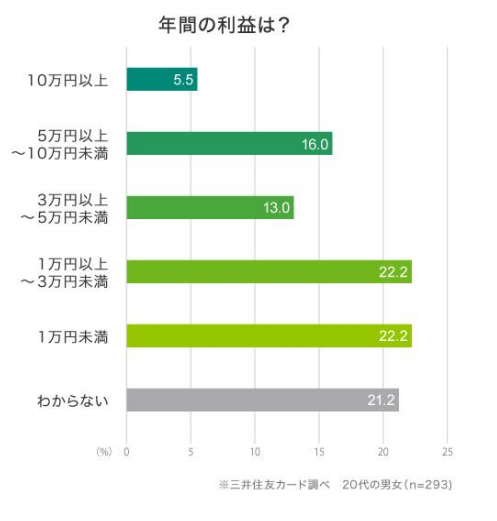 年間の利益では、全体で「1万円以上~3万円未満」(22.2%)と「1万円未満」(22.2%)が同率の1位。