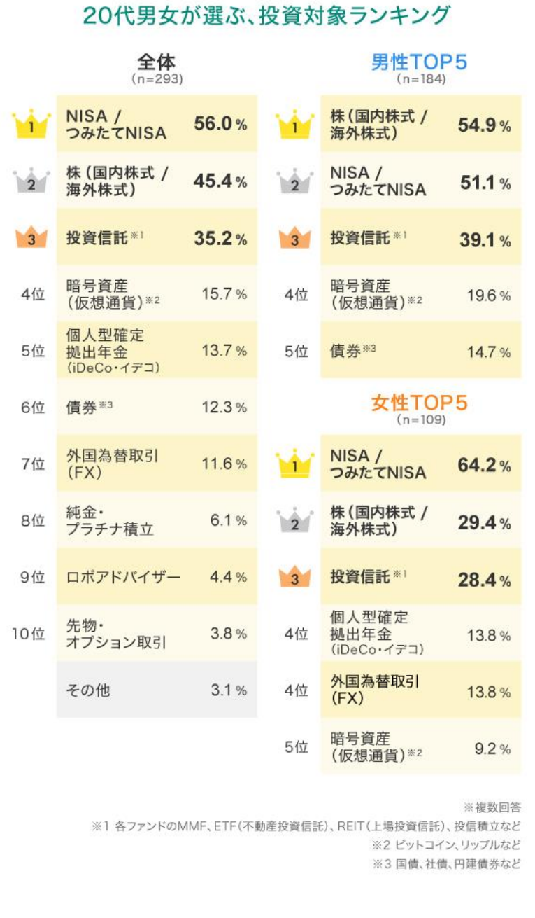 男女別に見ると、男性の1位は「株(国内株式/海外株式)」で、女性は「NISA/つみたてNISA」が1位でした。