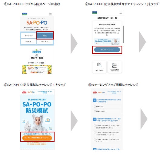 セゾン自動車火災保険株式会社(代表取締役社長:佐藤史朗、以下「当社」)は、サービスサイト『SA・PO・PO(サ・ポ・ポ)』(以下、『SA・PO・PO』)において、ヤフー株式会社(代表取締役社長 社長執行役員CEO:小澤隆生)が提供する「ヤフー防災模試※」とコラボした「もしもにソナエよう! SA・PO・PO防災模試」(以下、「SA・PO・PO防災模試」)を8月23日にリリースしました。