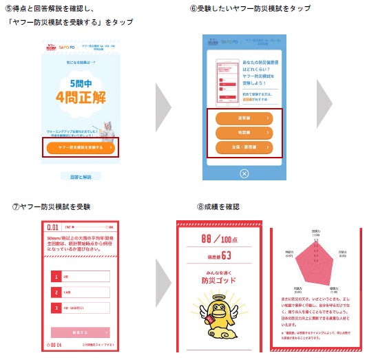 ウォーミングアップ編として、保険知識や災害時の車の活用方法、『SA・PO・PO』に関する当社オリジナル問題にチャレンジ後、本番受験として、災害に関する知識と対応方法を学べる「ヤフー防災模試」(速習編、地震編、台風・豪雨編の計3種類)にご参加いただけます。
