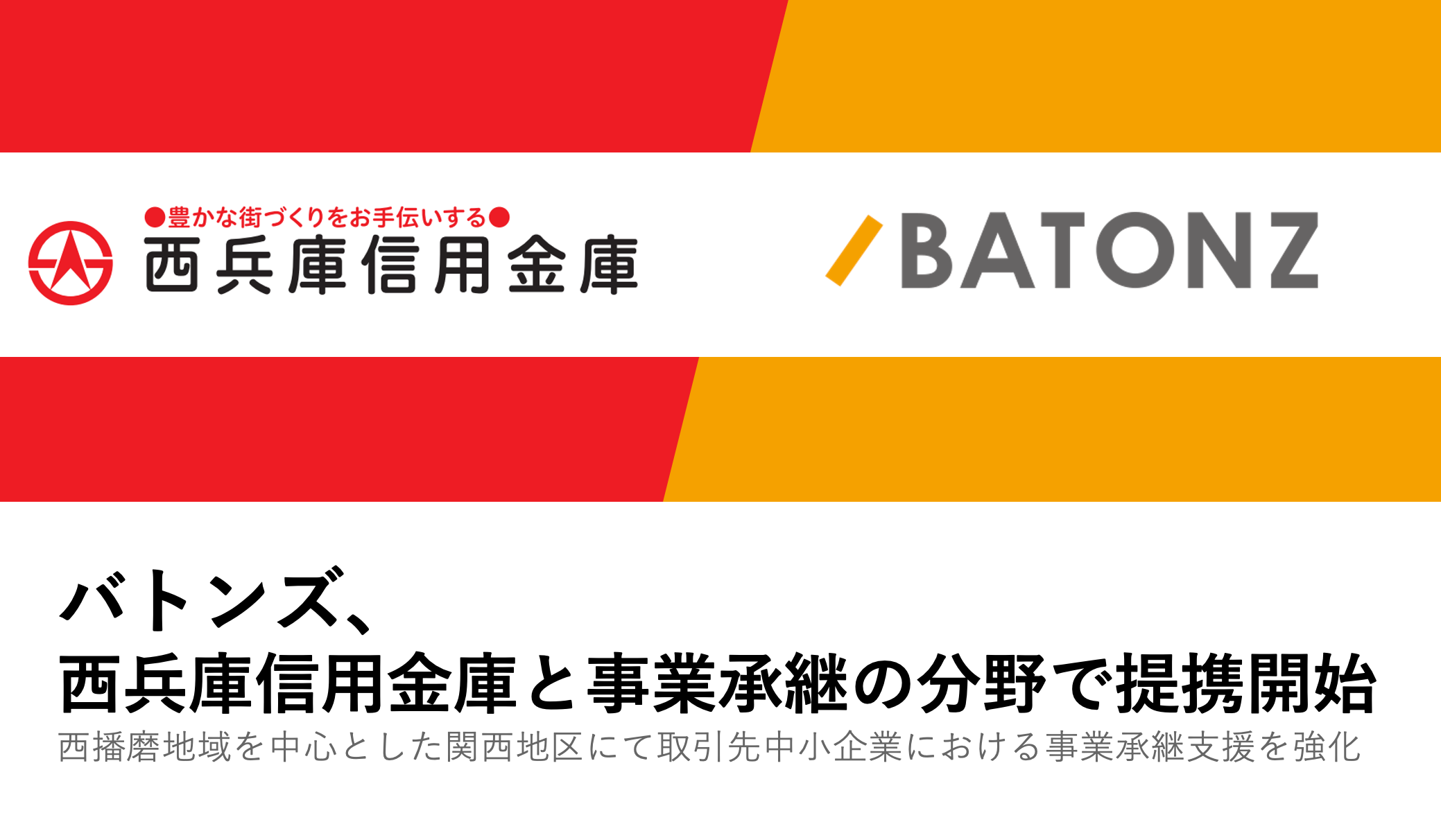 今回の提携では、後継者のいない中小企業・小規模事業者の第三者承継・M&Aをより推進するため、西兵庫信用金庫とバトンズが連携し、事業承継支援ネットワークを強化します。これにより、西播磨地域を中心とした後継者不在企業の事業承継を推進して価値ある事業を次世代へとつなげることで、雇用を守り地域経済の活性化を図ることを目的としています。