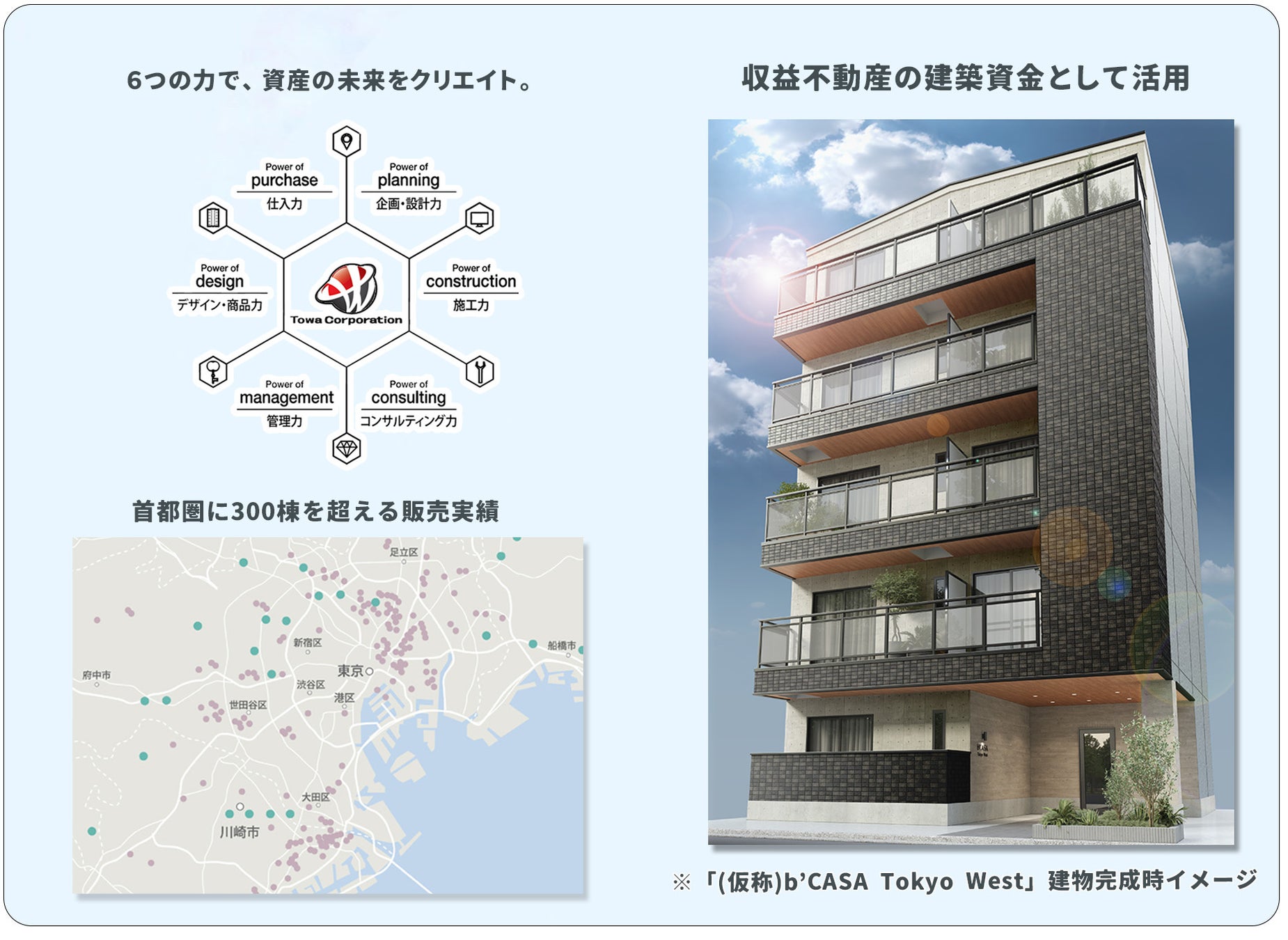 藤和コーポレーション株式会社は、「どこにもないがここにある」をコーポレートスローガンとし、「b‘CASA(ビー・カーサ)」シリーズをはじめとした住宅・オフィスビルの建設事業を中核とする不動産・建設会社です。販売棟数300棟を超える過去の実績・経験をもとに、土地の特性に合わせた建築を行うことで、高品質・短工期・高利回りを実現しています。