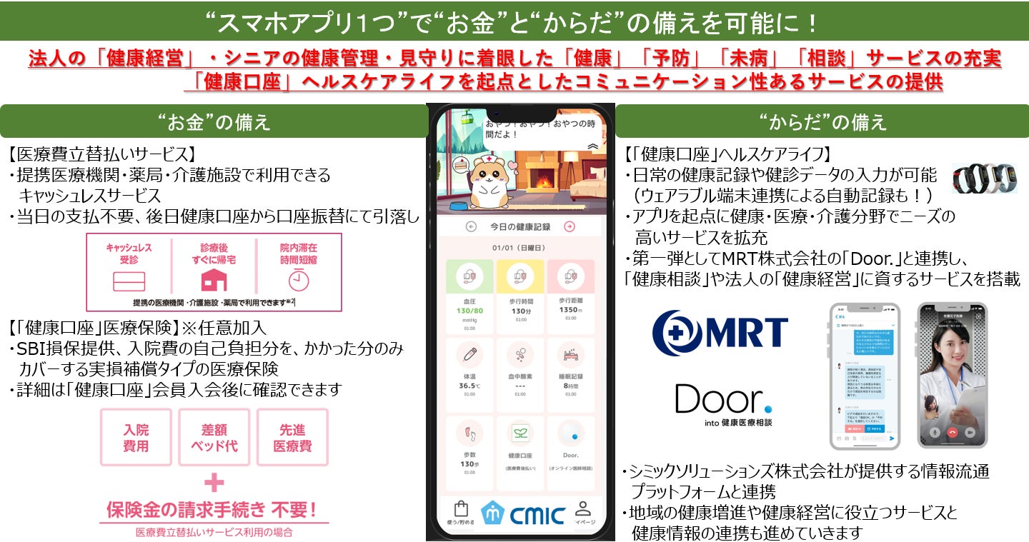 第一弾として、MRT株式会社が提供する医師ネットワークにつながるプラットフォーム「Door.」と連携し、チャットなどによる「健康相談」や、法人の「健康経営」に資する「産業保健連携」といったサービスを提供し、お客さまの健康生活を包括的にサポートします(※3)。