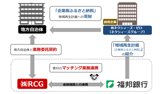 株式会社福邦銀行(頭取 湯浅 徹)と株式会社RCG(代表取締役 天間 幸生)が連携するビジネスマッチング業務を通じて、株式会社ネクシィーズグループ(本社:東京都渋谷区 代表取締役社長 近藤太香巳)の子会社である株式会社ネクシィーズ・ゼロより、10自治体の脱炭素に繋がる地域再生計画に賛同し、計1,000万円の寄附が行われましたのでお知らせいたします。