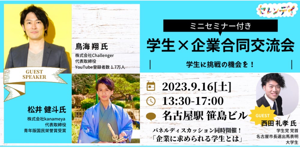 当日の講演テーマは「夢を現実にするために必要な金融知識との向き合い方!」です。企業の役員3名をゲスト迎え、パネルディスカッションを実施します。本交流会は、学生向けメディアサイト「セレンデイ」初のリアルイベントとなり、学生と社会人が交流し、ともに新しい価値観をつくることを目的としています。