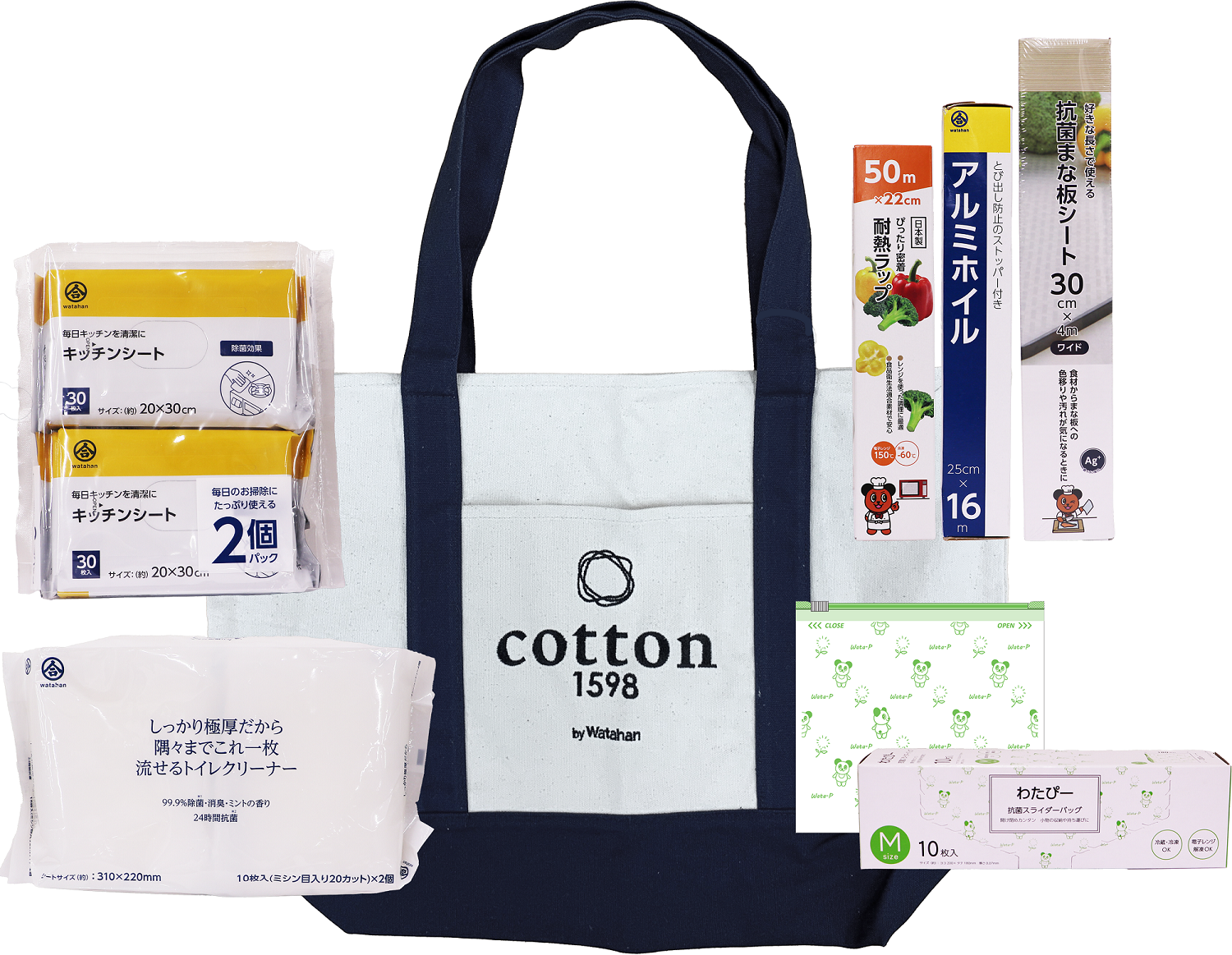 お買物やお出かけに便利なトートバッグとご家庭でご利用いただける日用品を詰合せた7点セットです。