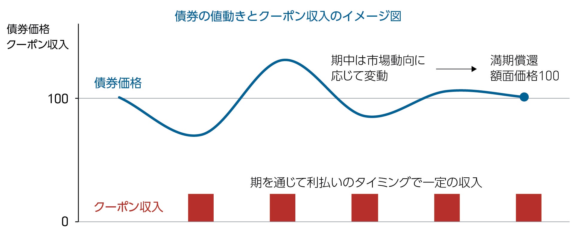 債券は一般的に、発行時の条件に従って定期的にクーポンが支払われ、満期日に額面金額が支払われます。当ファンドは償還まで保有することで、債券価格の変動による影響を抑制しつつ、安定的なクーポンの積み上げを期待できます。(イメージ図注記は文末ご参照。)