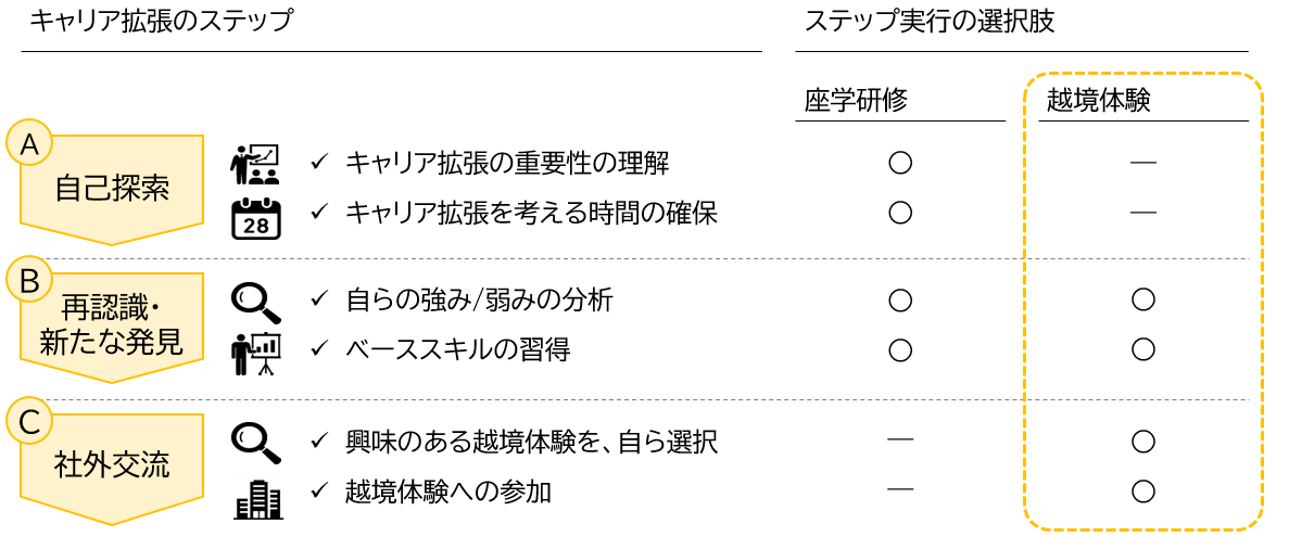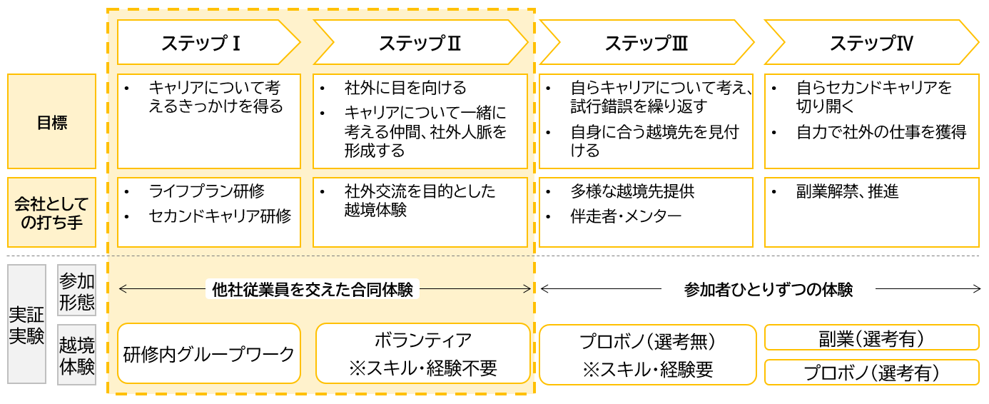 コンソーシアムでは、セカンドキャリアを切り開くまでのステップを4つに分けた上で、まずは社外に目を向け、社外人脈を形成することを狙いとした越境体験から始めることが重要と考えています。