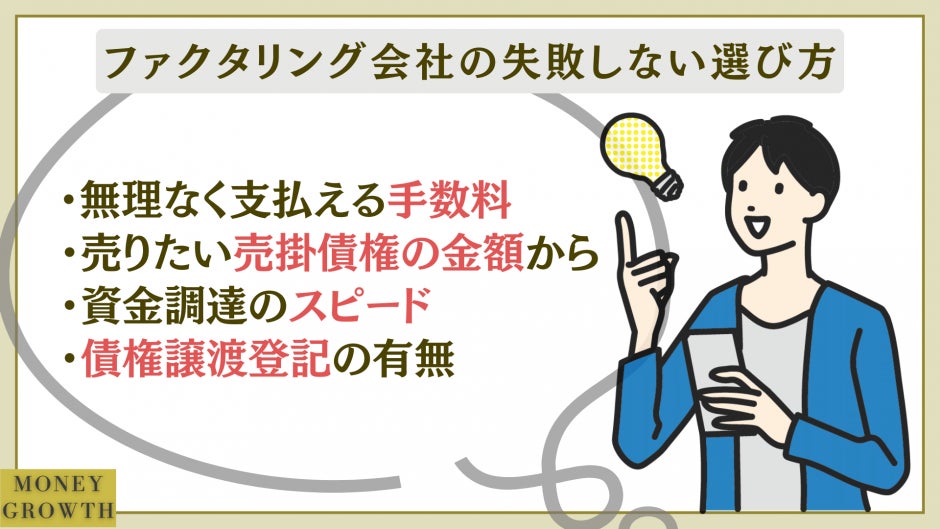 ファクタリング会社選びで、失敗しないためにおさえたいポイント・選び方が下記の4つです。