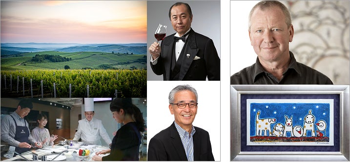 【画像】カルチャーラボ第5期は、ルーマニア大使館での講座(左上:葡萄畑)、フランス料理教室(左下:東京會舘 深町校長)、山梨ワインのペアリング講座(中央上:ソムリエの田崎真也氏)、話し方講座(中央下:須田哲夫氏)の4講座をご用意。(右上)オランダ出身の現代アーティスト、ハンス・イヌメ。(右下)同氏の代表作『仲良く並ぶ・・・・』