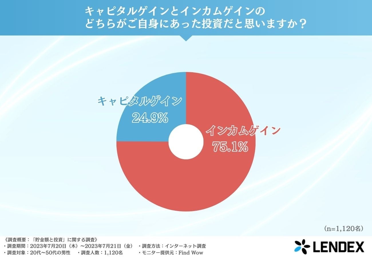 「キャピタルゲインとインカムゲインのどちらがご自身にあった投資だと思いますか?」と質問したところ、『インカムゲイン(資産を保有していることによって得られる収益のこと)(75.1%)』『キャピタルゲイン(保有している資産を手放す(売却など)ことによって得られる収益のこと)(24.9%)』という結果となりました。