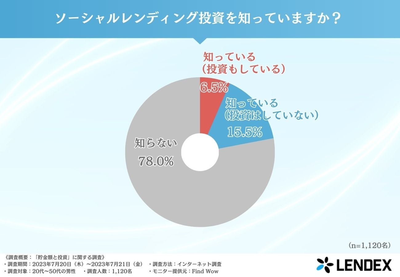 「ソーシャルレンディング投資を知っていますか?」と聞いたところ『知っている(投資もしている)(6.5%)』『知っている(投資はしていない)(15.5%)』と知っている方は全体の2割ほどに留まりました。