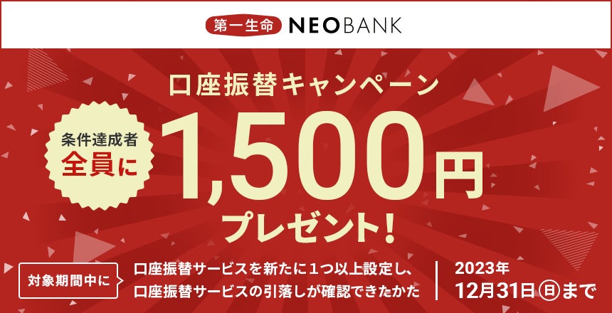 期間中に、第一生命支店で口座振替サービスを新たに1つ以上設定し、口座振替サービスの引落しが確認できた方に1,500円をプレゼントいたします。