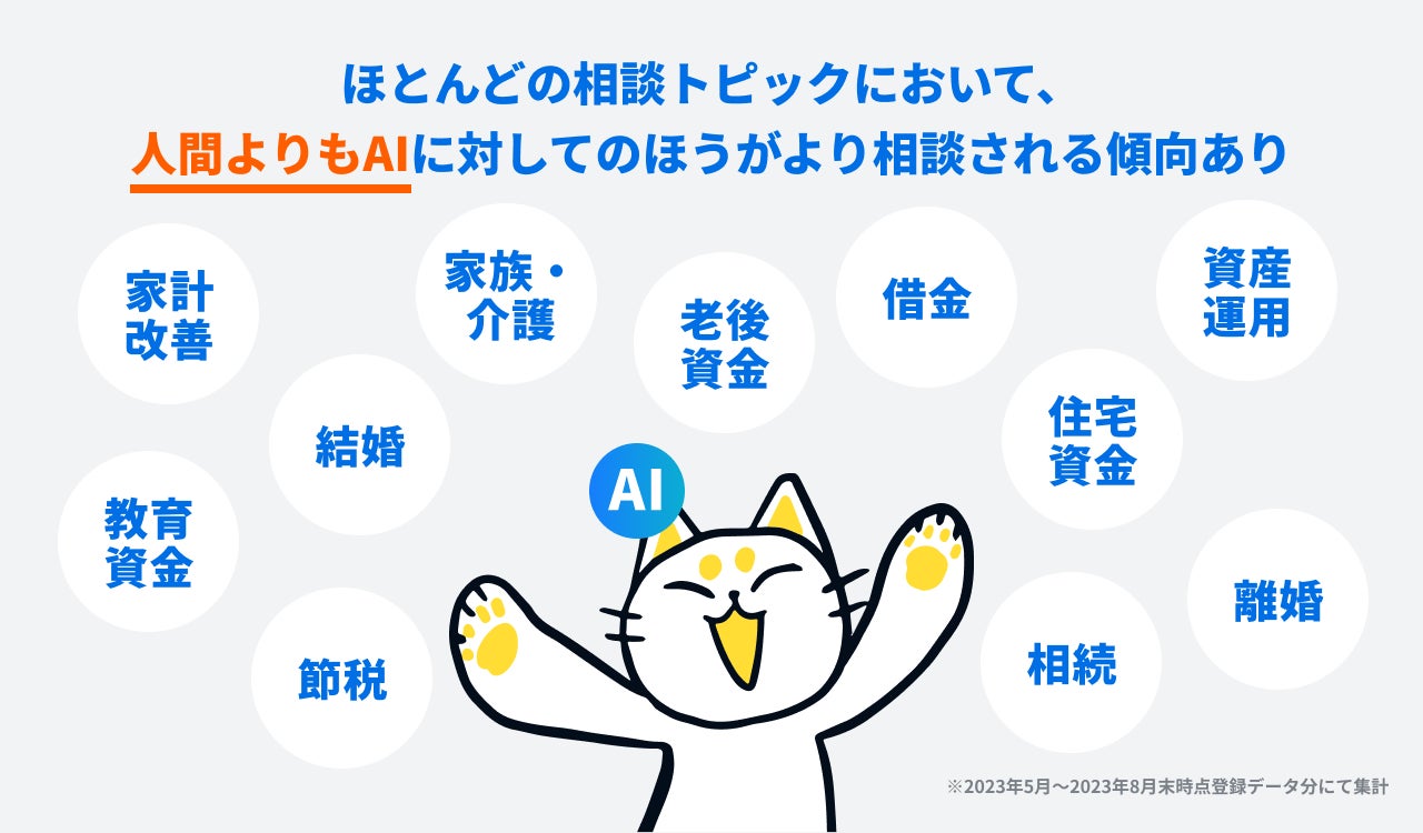 家計改善、家族・介護、教育資金、結婚、資産運用、借金、住宅資金、節税、相続、離婚、老後資金 に関する相談トピックについて、専門家(対人間)よりもAIおかねこに対しての方が、より相談されやすい傾向があることが分かりました。