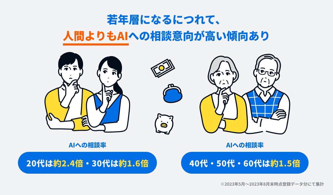 AIおかねこへの相談意向の比重を見ると、すべての年齢層においてAIおかねこへの相談への比重が高くなっており、20代は約2.4倍、30代は約1.6倍、40代50代60代は約1.5倍とAIに相談する傾向が高い結果となりました。