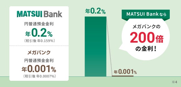 ※4 「MATSUI Bank」は2023年10月1日時点の適用予定の金利。メガバンクは2023年9月1日時点の金利。メガバンクは三菱UFJ銀行、三井住友銀行、みずほ銀行を対象。年利率・税引き前。個人のお客さまについては、利息に対して20.315%(国税15.315%(復興特別所得税を含む)、地方税5%)の税率により源泉徴収されます(源泉分離課税)。マル優のお取扱いはありません。円普通預金の金利は変動金利です。
