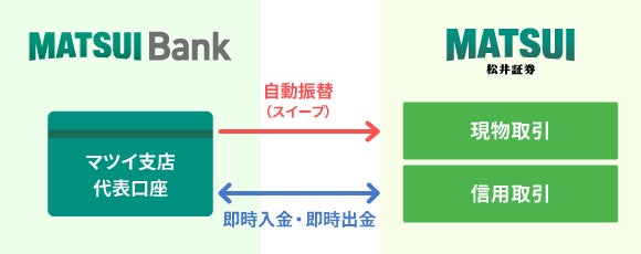 「MATSUI Bank」の口座へ預け入れたお金は、お客様が松井証券でお取引する際に自動的に振り替えられ*3、株式等の取引資金としてご利用いただけます。また、「MATSUI Bank」口座と松井証券口座間で即時の入出金もご利用いただけます。