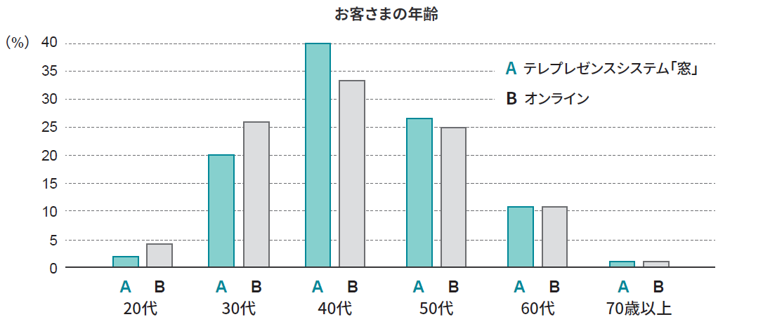 ・テレプレゼンスシステム「窓」をご利用いただいているお客さまは40代と50代が多い結果に。ご利用いただいたお客さまからは「対面と同じような安心感」を評価いただいています。