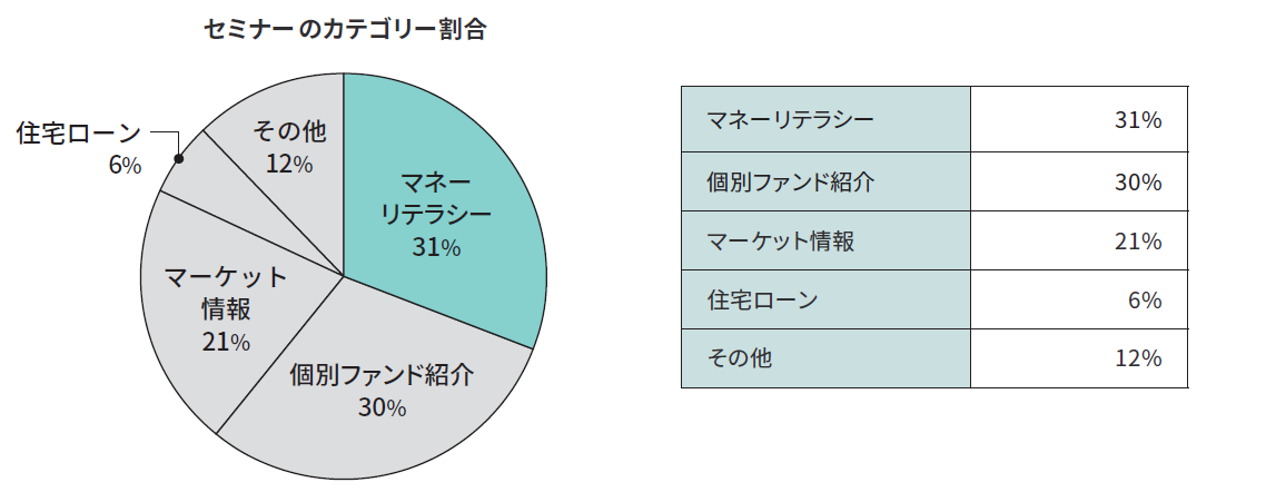TOPICS 3:ソニー銀行が提供するオンラインセミナーのうち、「マネーリテラシー」のコンテンツが最も多く31%に。