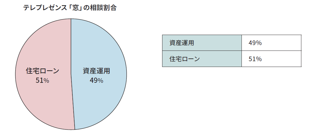 ・テレプレゼンスシステム「窓」を利用した相談は、資産運用と住宅ローンがほぼ同じ割合に。